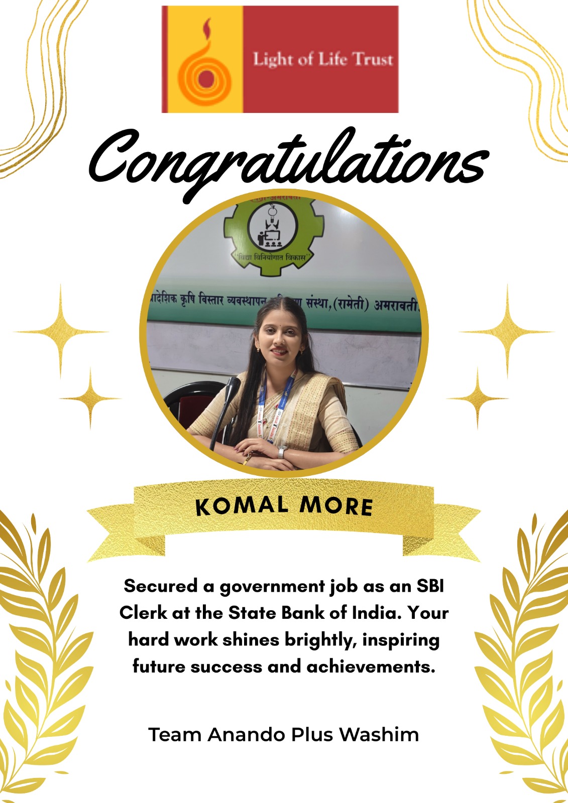 “ Mr Akshay Kamble, an Anando Plus student from Manora Centre, Washim District, Maharashtra State, who successfully completed his Bachelor of Engineering (B.E) in Mechanical Engineering from Amravati, has secured a job as a Software Testing Engineer with a software company in Hyderabad. He has been offered this position at a package of 4.5 lac per annum. Light of Life Trust wishes him the best of luck in his future endeavours. ”